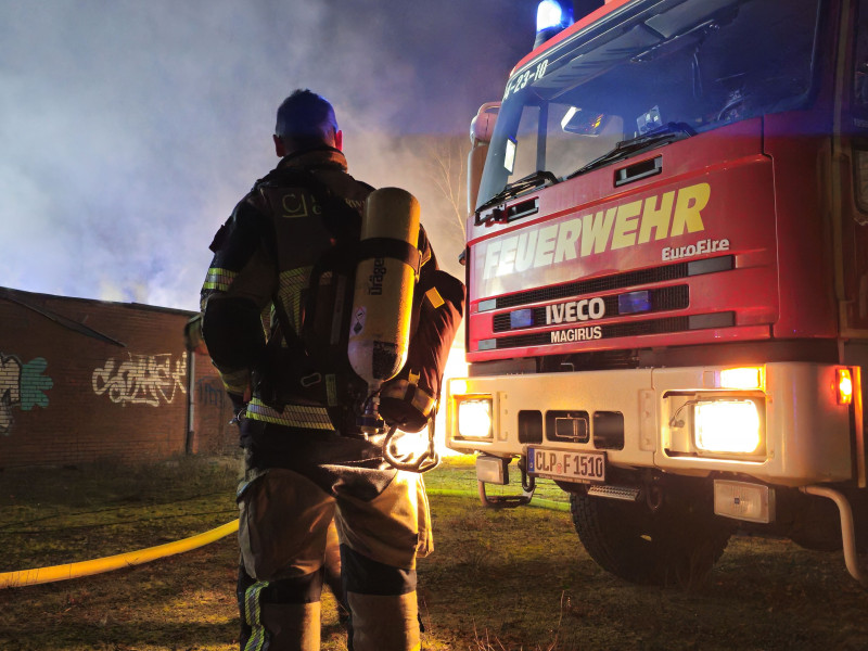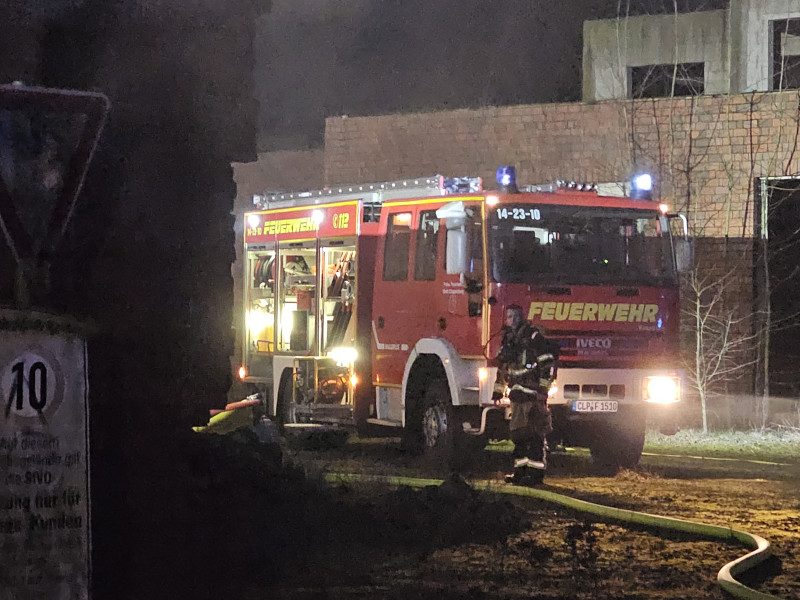 Zweimal hat es in den vergangenen Jahren in der ehemaligen Raststätte Cloppenburger Land gebrannt. In der Nacht auf Samstag brannte es dann zum dritten Mal. Jetzt war es die Kegelbahn. Als wir gegen 00:45 eintrafen schlugen Flammen aus dem vorgebauten Gastraum. An einen Löscheinsatz im Inneren des Gebäudes war nicht denken. Zu groß wäre die Gefahr für unsere Atemschutztrupps gewesen. Also löschten wir von außen mit dem Strahlrohr und über den Wasserwerfer der Drehleiter. Das Flachdach der Kegelbahn stellte ein Problem dar. Wir schufen uns zunächst eine Öffnung im Mauerwerk um auch in der Bahn löschen zu können. Dabei kamen eher selten genutzte Werkzeuge wie der benzingetriebene Trennschneider zum Einsatz. Später stand uns ein Bagger zur Verfügung. Zunächst von einem technischen Betrieb in der Nachbarschaft, dann vom städtischen Bauhof. Als das Dach entfernt war, flammte es noch einmal gut auf, das bekamen wir aber schnell in den Griff.