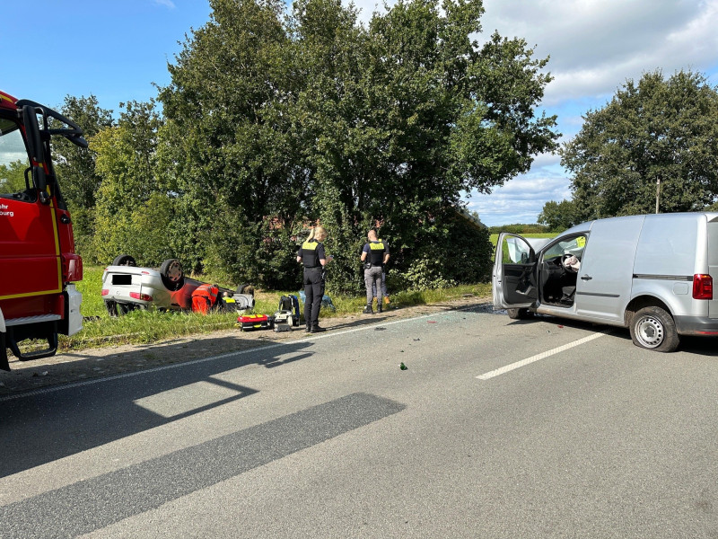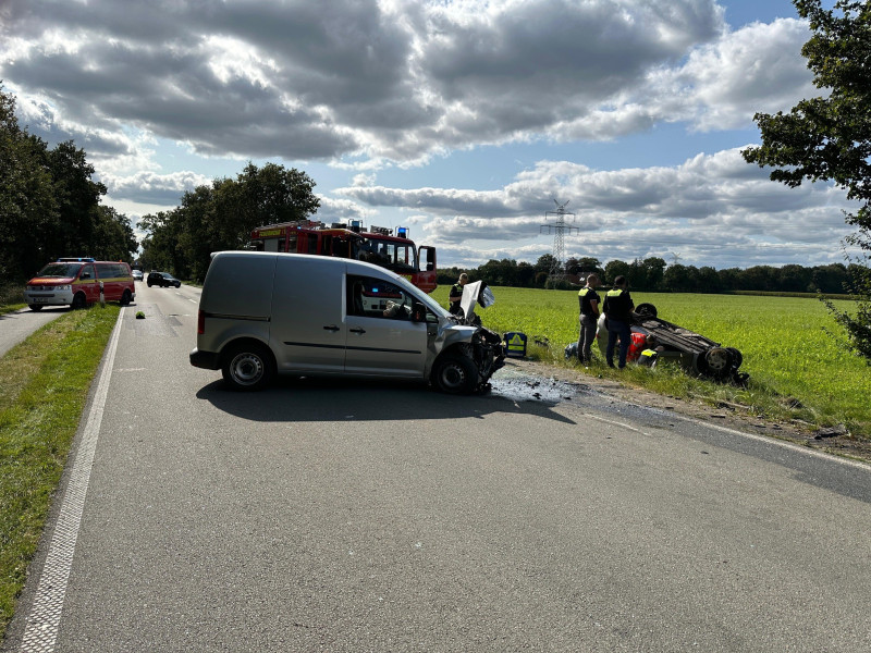 Am 14. September um 12:59 Uhr wurden wir direkt nach dem Einsatz Rauchmelder privat zu einem Verkehrsunfall auf dem Beverbrucher Damm gerufen. Da wir gerade dabei waren die Einsatzstelle abzubauen, konnten wir schnellstmöglich mit unseren Fahrzeugen die Einsatzstelle anfahren. Auf dem Weg dorthin wurde uns mitgeteilt, dass der Einsatz im Einsatzgebiet der Feuerwehr Garrel liegt. Beim Eintreffen lag ein Fahrzeug auf dem Dach und ein weiteres mittig auf der Straße. Nach Rückmeldung des Rettungsdienstes waren keine Personen eingeklemmt. Somit bestand unsere Aufgabe darin, Betriebsstoffe aufzunehmen und den Brandschutz sicherzustellen.