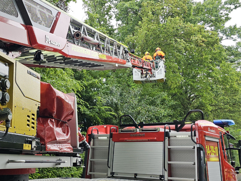 Wir zerlegten das Bruchstück in handhabbare Teile und lagerten diese gesichert am Straßenrand. Anschließend wurde die Drehleiter in Stellung gebracht, um den betroffenen Baum weiter auf mögliche Gefahrenstellen zu prüfen. Lose Reste in der Krone wurden entfernt, um eine Gefährdung für den Straßenverkehr auszuschließen.