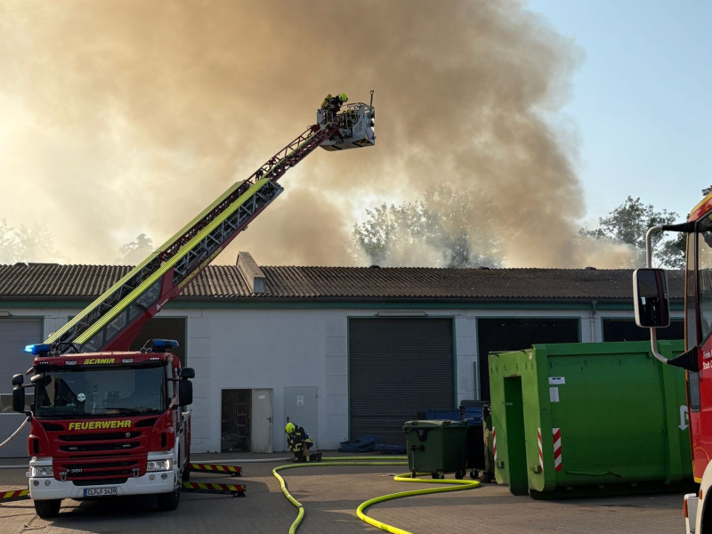 Brand einer Halle – Unterstützung mit Drehleiter