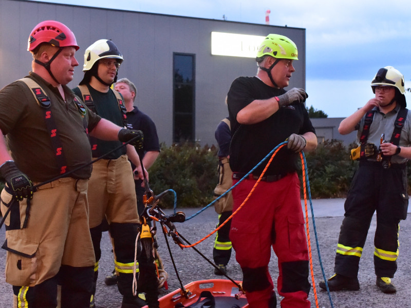 Für die eingesetzten Kräfte war es ein besonderes Objekt: Eine Kraftfuttermühle ist eine Herausforderung. Mit dem Atemschutzgerät in den fünften Stock hinauf ist eine richtige Anstrengung. Die Wärme in der Anlage verstärkt das Ganze – eine schweißtreibende Angelegenheit. Die vier großen Silos boten für unsere Höhensicherungsgruppe eine perfekte Möglichkeit, realitätsnah zu üben.