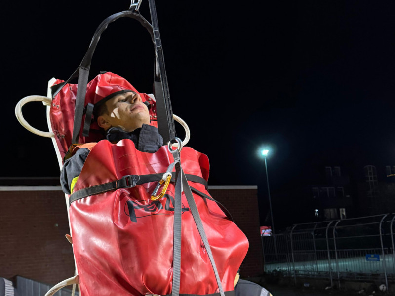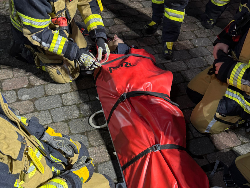 Die dritte Gruppe widmete sich dem Thema Schachtrettung. Hierbei wurde der sichere Umgang mit der Drehleiter trainiert, um Personen aus tiefer gelegenen Schächten oder ähnlichen Einsatzstellen retten zu können. Solche Einsatzlagen erfordern ein besonders koordiniertes Vorgehen sowie den sicheren Umgang mit der eingesetzten Technik.