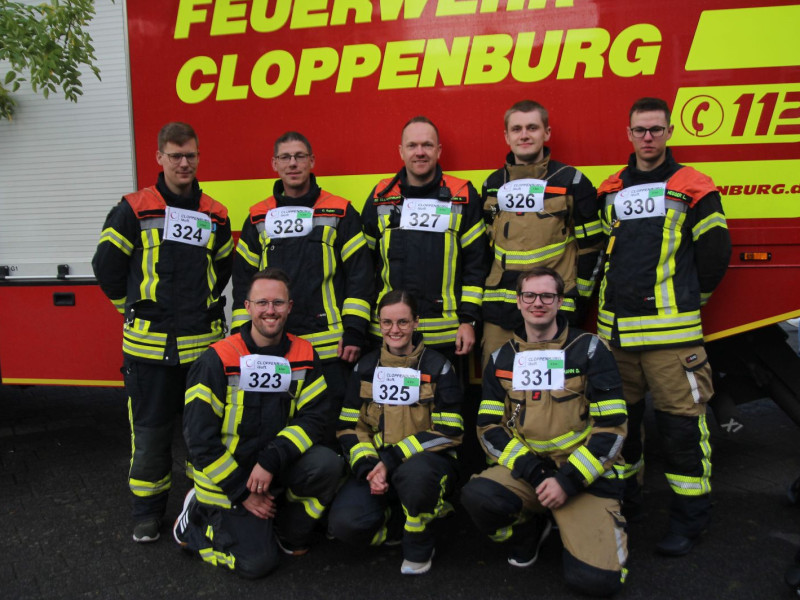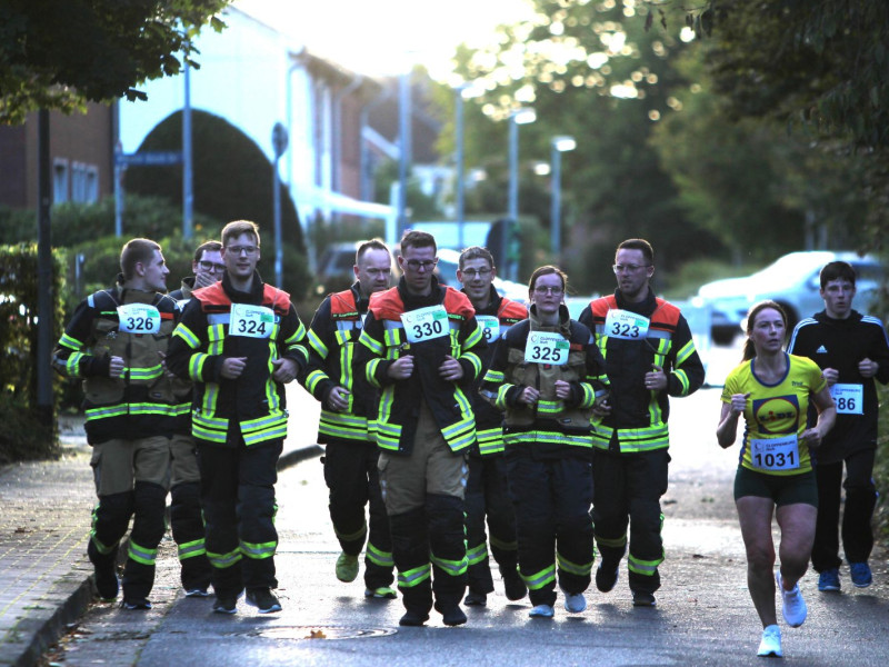 Gegen 17 Uhr ging es für die nächste achtköpfige Gruppe weiter. Hier galt es, den 6-Kilometer-Lauf in Einsatzbekleidung und Laufschuhen zu absolvieren. Auch hier waren die Zuschauer begeistert. Über den großen Streckenverlauf blieb die Gruppe immer zusammen und lief ins Ziel ein.