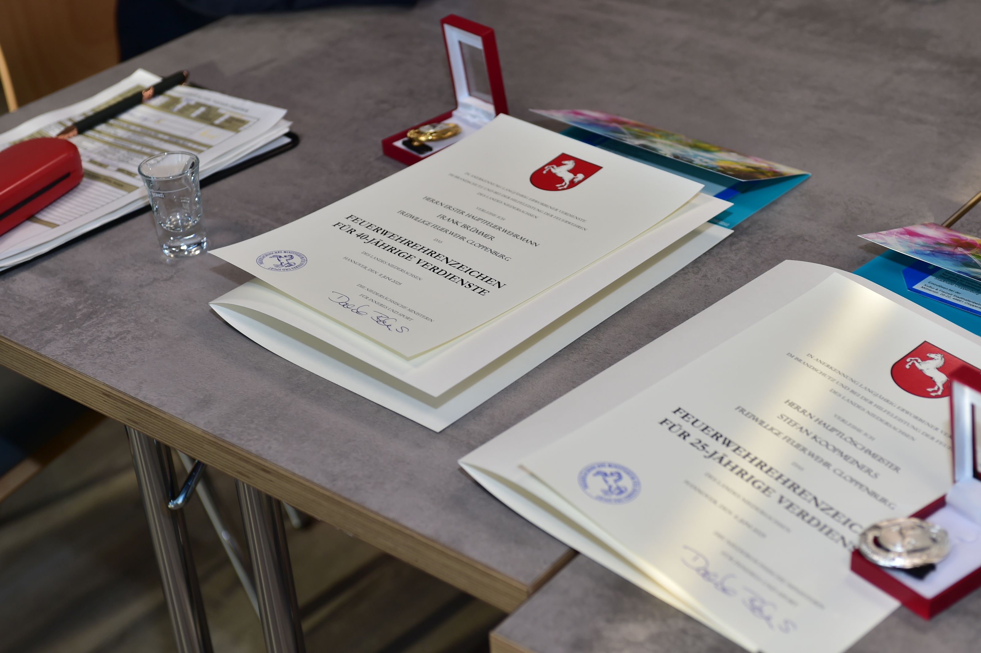 Im Anschluss folgte die Ehrung von Frank Brümmer mit dem Niedersächsischen Feuerwehr-Ehrenzeichen für 40 Jahre im Dienst. Seit 1990 ist Frank in der Einsatzabteilung, und von 2002 bis 2015 war er Atemschutzwart – eine Aufgabe, die er mit besonderem Engagement ausgefüllt hat. „Brümmi“ und seinem damaligen Mitstreiter haben wir zu verdanken, dass wir heute eine erstklassig ausgestattete Atemschutzgerätewarte unser Eigen nennen. Mit seiner ruhigen, zuverlässigen Art ist er bis heute eine große Stütze der Feuerwehr. Besonders nach seiner familiär bedingten Pause ist es schön zu sehen, dass „Brümmi“ wieder regelmäßig mit dabei ist.