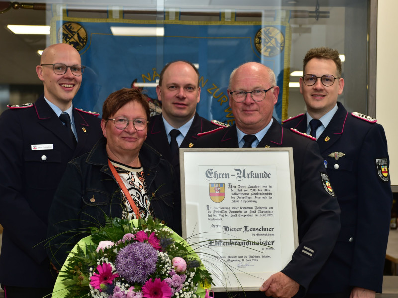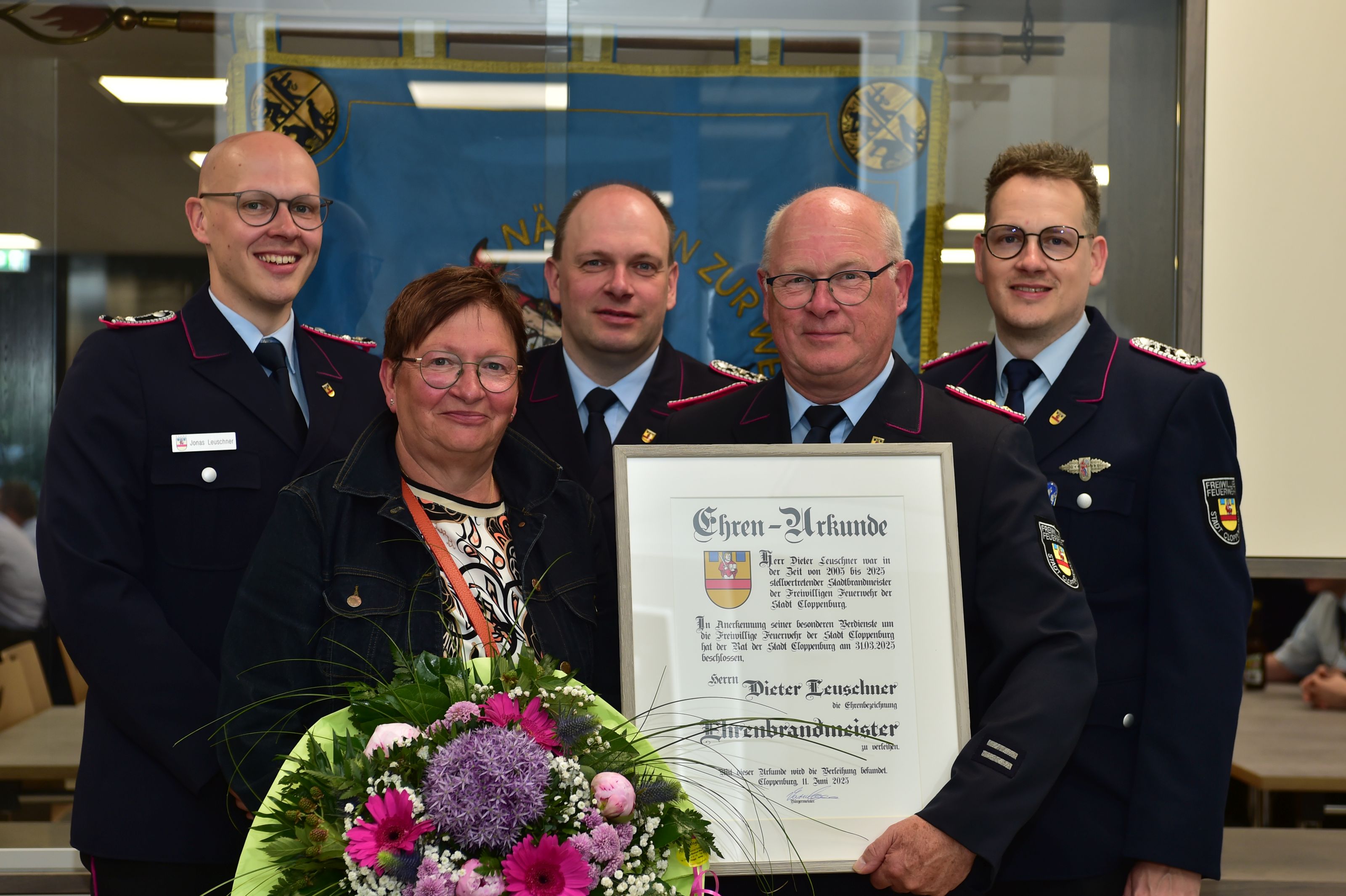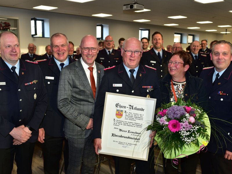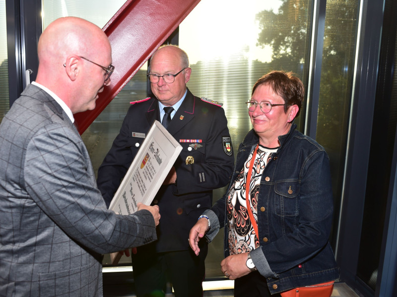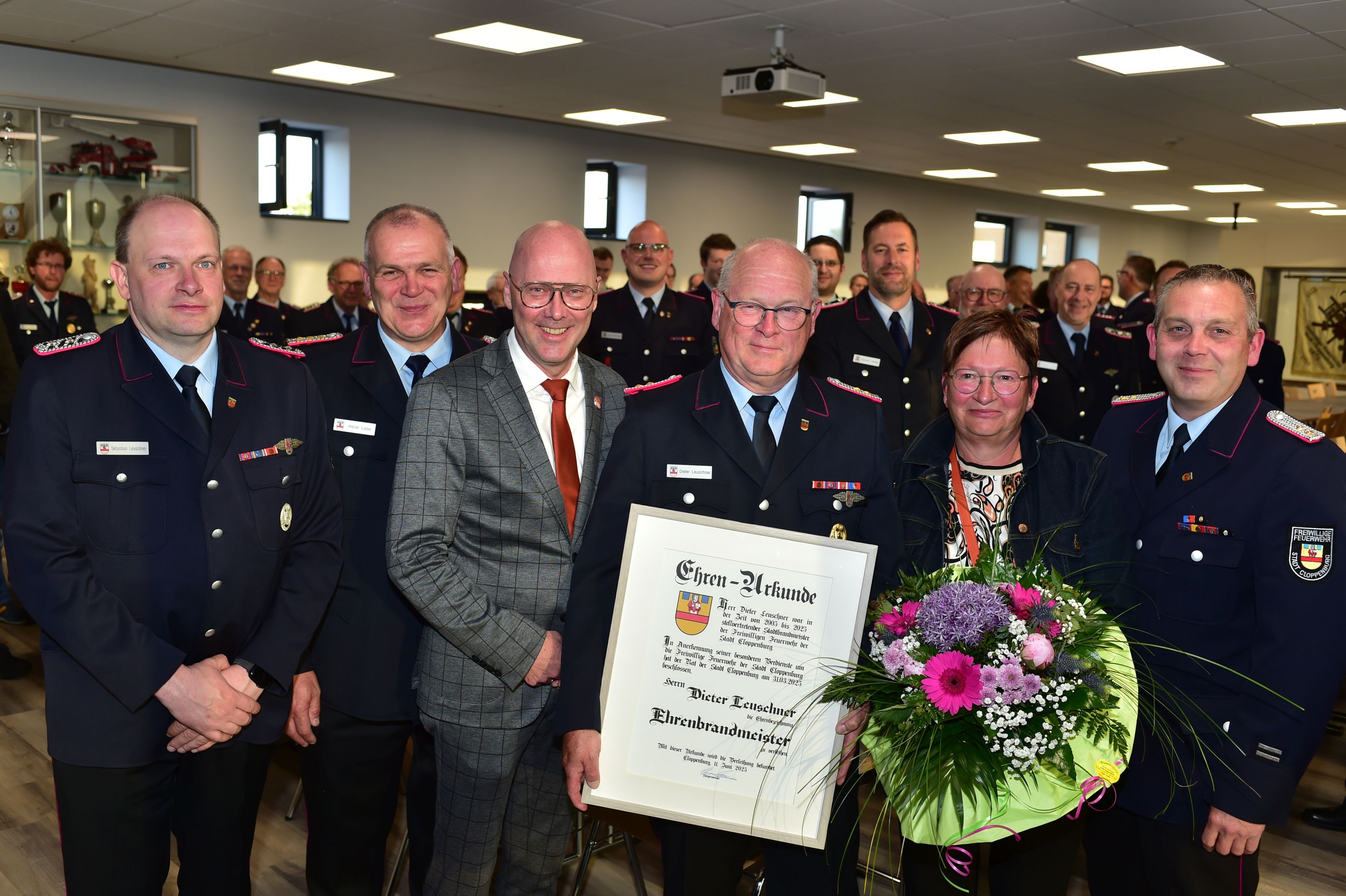 Dieter erschien in Begleitung seiner Frau Mechtild. Man konnte ihm die Rührung deutlich ansehen, als er die kunstvoll gestaltete Urkunde aus den Händen des Bürgermeisters entgegennahm. Der Applaus war anhaltend, die Glückwünsche herzlich. Dieter ist damit der zweite Ehrenbrandmeister der Feuerwehr Cloppenburg – nach Kurt Lade, dem Vater des heutigen Stadtbrandmeisters Horst Lade.