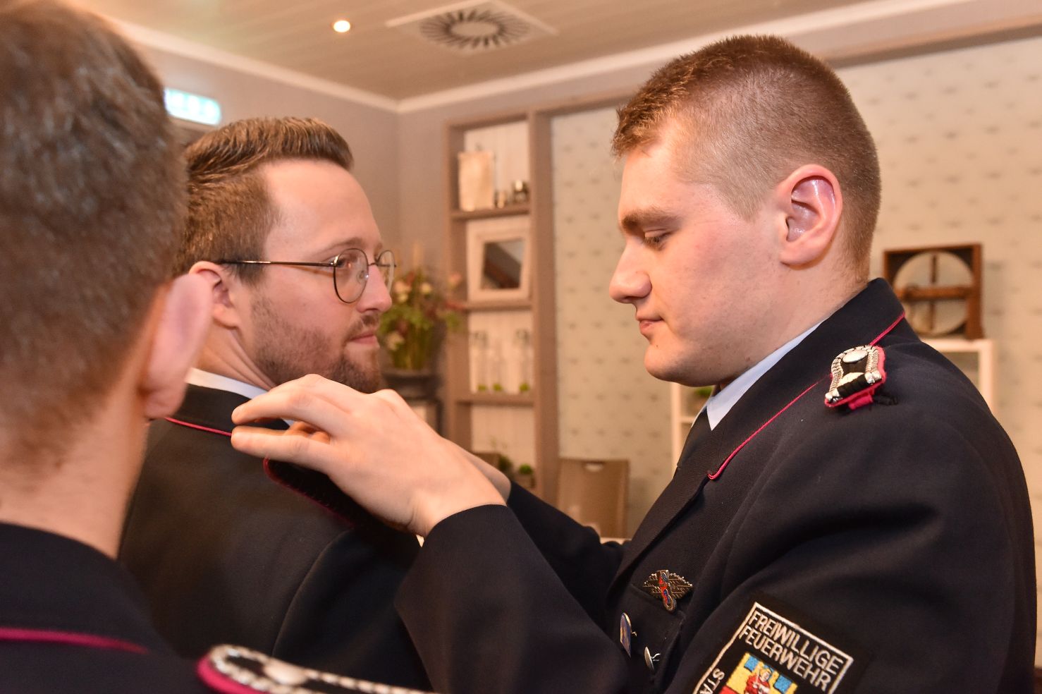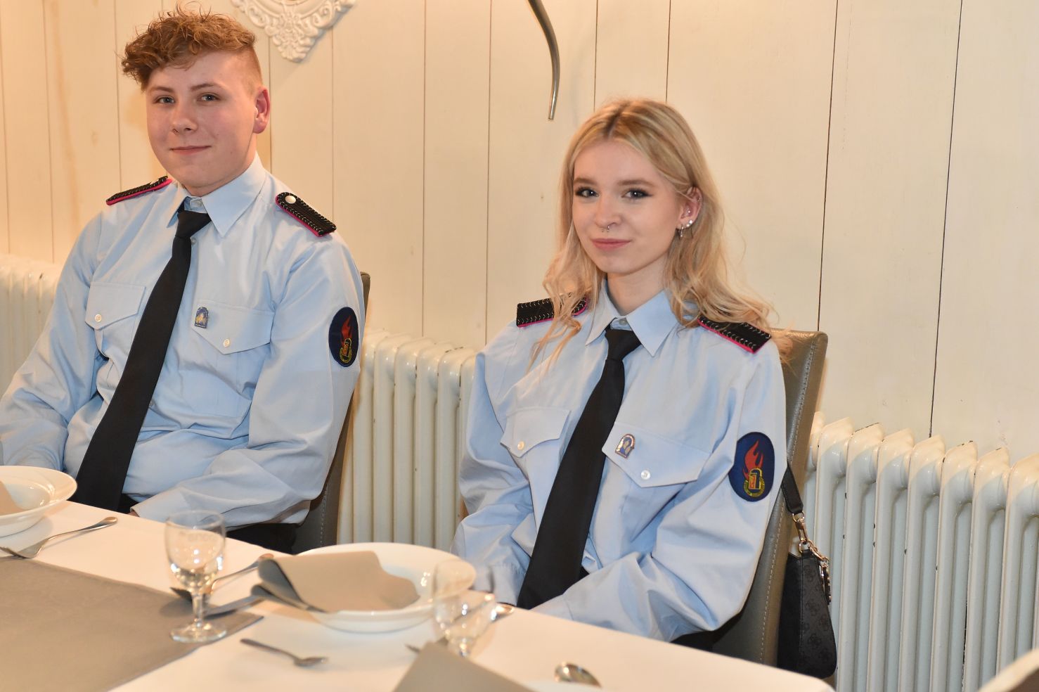 So viele Junge Leute frisch in der Wehr. Da gibt es natürlich auch unglaublich viele Sterne zu verteilen. Noch ganz ohne Stern sind die Vier, die aus der Jugendfeuerwehr in die Aktive kamen. Celina Gabriel, Michael Rauch, Falko Fenske, Tyler Laskowski. Sie haben uns schon ein paar Wochen im Dienst begleitet, jetzt sind sie auch offiziell dabei und zwar als Anwärter zum Feuerwehrmann bzw. Feuerwehrfrau.