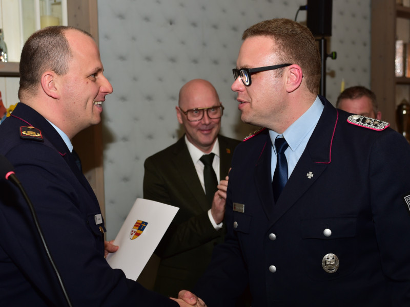 Natürlich gab es auch dieses Jahr wieder Beförderungen. Und dazu in diesem Jahr etwas ziemlich Exotisches, hatten wir so auf einer Generalversammlung auch noch nicht: Umwidmungen. Wir haben ja ein neues Dienstgradsystem. Nicht jeder ist davon restlos begeistert, aber es ist, wie es ist. Und so wird dann aus dem Hauptlöschmeister plötzlich der Hauptbrandmeister. Tja, die Qualifikation, Ausbildung und persönliche Fähigkeiten bleiben gleich, die Bezahlung übrigens auch, die gibt es natürlich nach wie vor nicht.