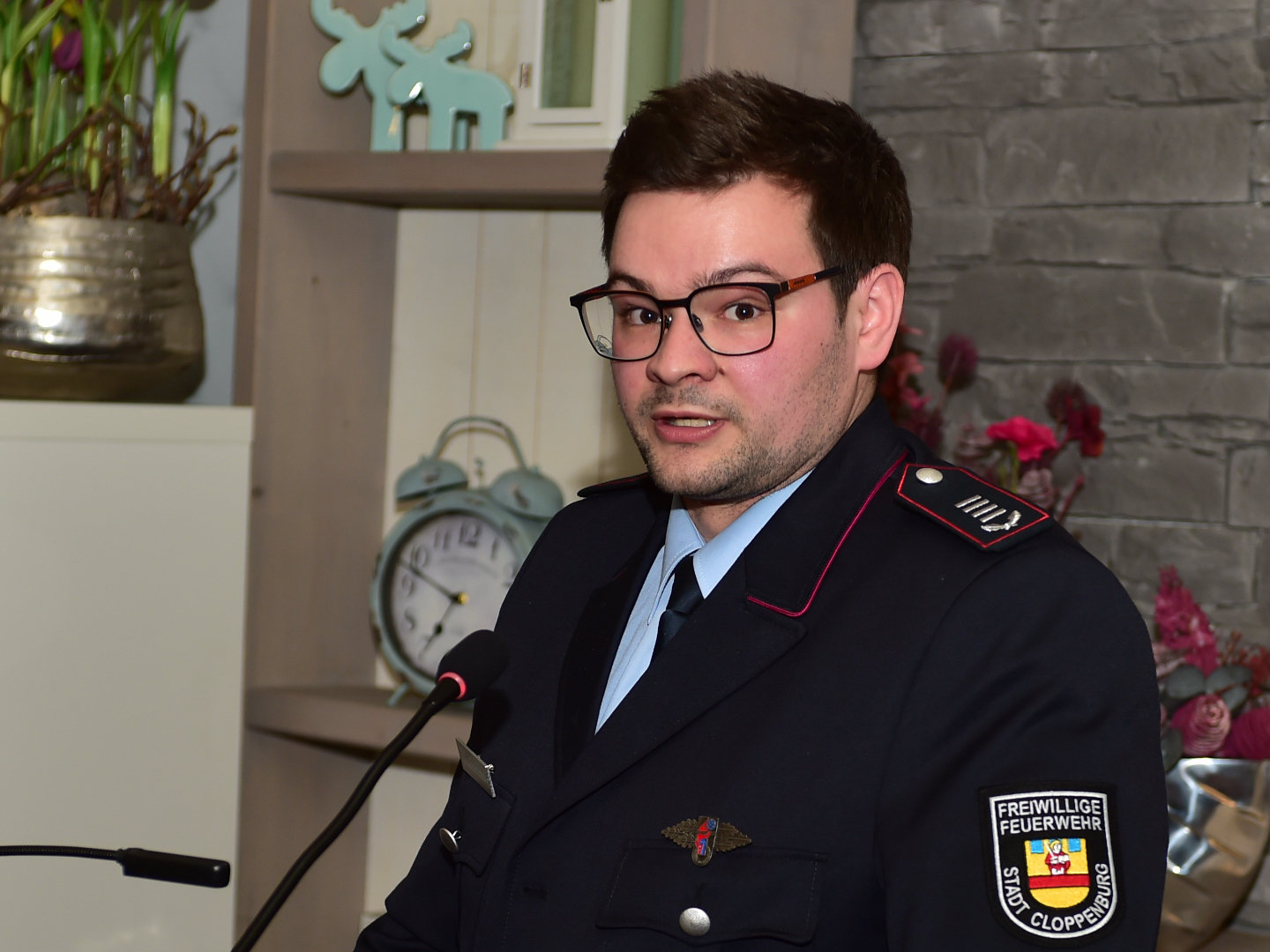 Stefan Abshof, einer aus unseren Reihen, überbrachte als stellvertretender Kreisbrandmeister die Grußworte der Kreisfeuerwehr. Und da ging sein Blick nicht nur auf das, was gerade im Landkreis läuft, sondern durchaus auch ein Stück weiter, nämlich über den Oldenburgischen Feuerwehrverband bis in Richtung Hannover. Kritisch will man sein mit Hannover, aber nicht nur um kritisch zu sein, sondern konstruktiv kritisch, also konstruktiv. Dinge klar ansprechen, ohne sie schlecht zu reden. Das wollte er deutlich machen.