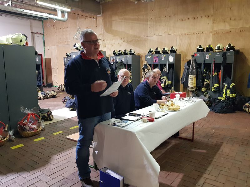 Unser Stadtbrandmeister lässt das vergangene Jahr Reveu passieren. Diesmal in der Fahrzeughalle, etwas provisorisch dennoch gemütlich, da der "alte" Versammlungsraum zu klein und der neue noch nicht bezugsfertig ist.